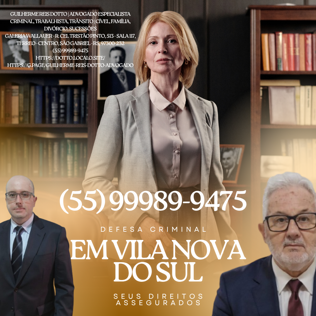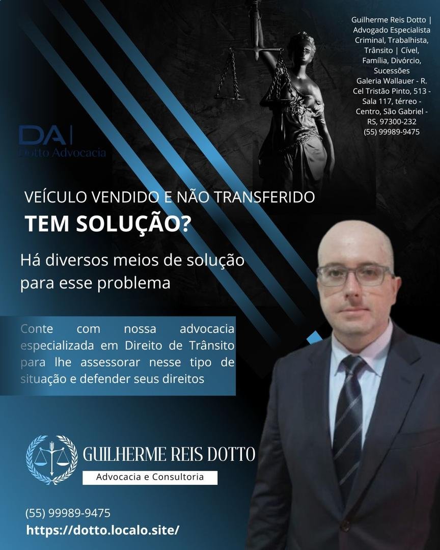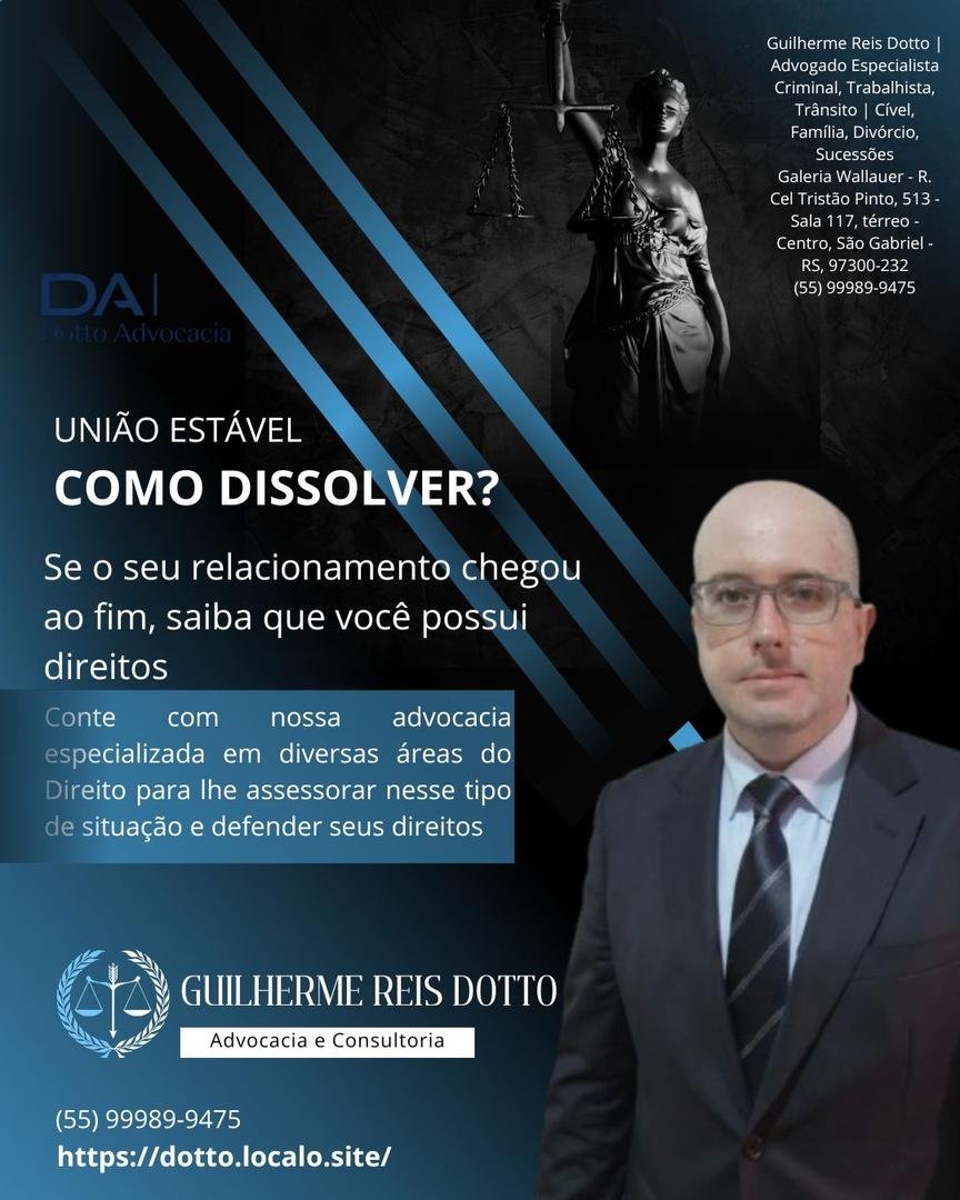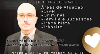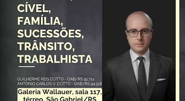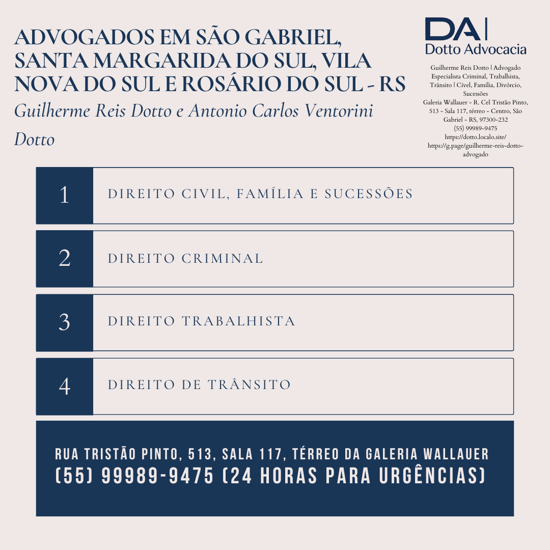 Escritório de advocacia: Trabalhista, Criminal, Cível, Família, Sucessões e Trânsito + Advogado especialista em Direito Processual Civil, Trabalhista, Trânsito e Penal. + Ampla experiência em Divórcio litigioso ou consensual, dissolução de união estável, guarda, alimentos, inventário, adoção, interdição. + Defesas e Recursos de multa, suspensão e cassação de CNH, ação de transferência de pontos. + Atuação física em São Gabriel/RS, na Rua Tristão Pinto, 513, na Galeria Wallauer, Térreo, Sala 117. Atuação em: Rosário do Sul, Santa Margarida do Sul, Vila Nova do Sul. + Advogados Guilherme Reis Dotto, OAB/RS 91.714 e Antônio Carlos Ventorini Dotto, OAB/RS 94.518 24 horas para Urgências: (55) 99989-9475 Agende sua consulta agora mesmo!