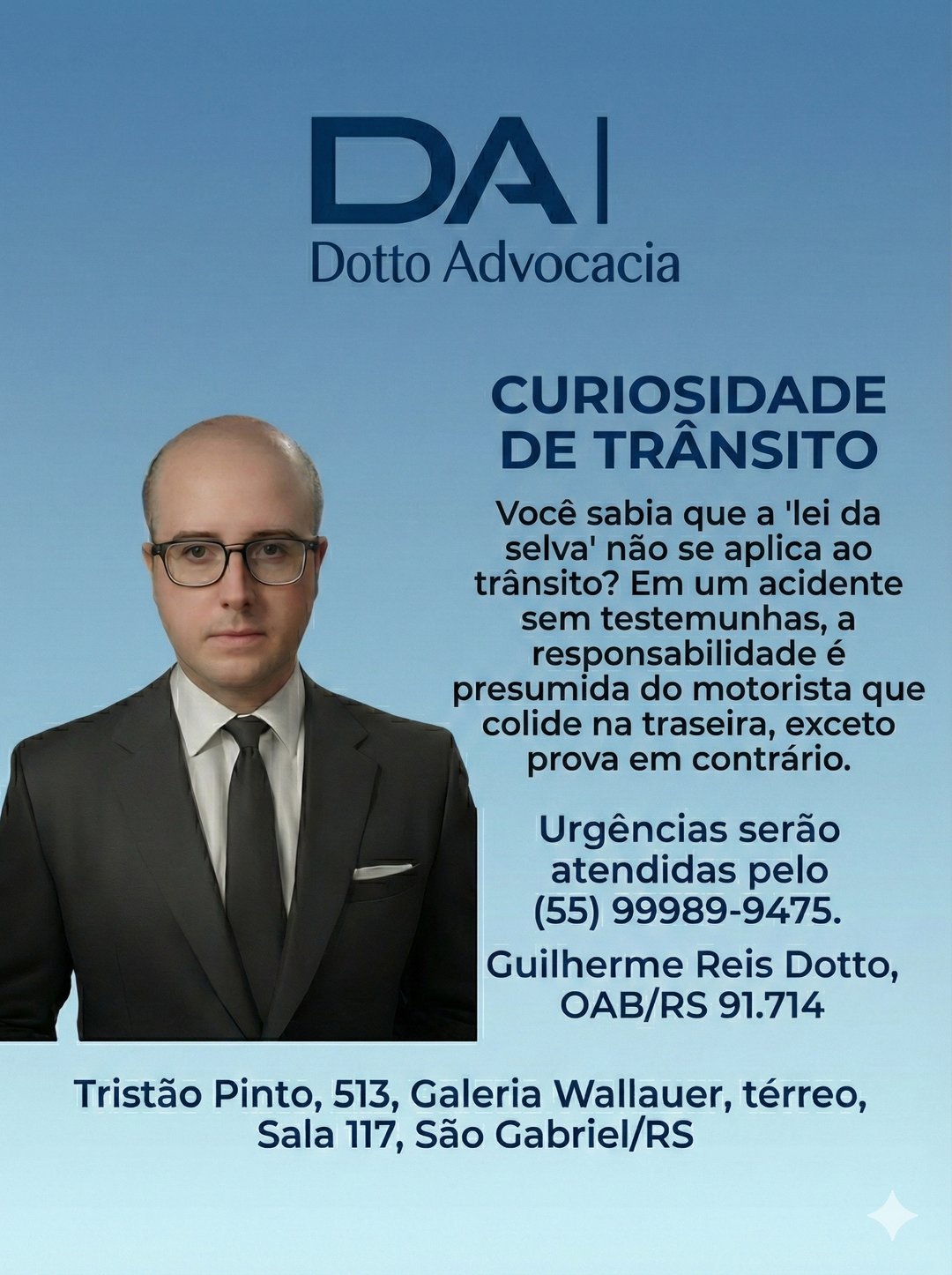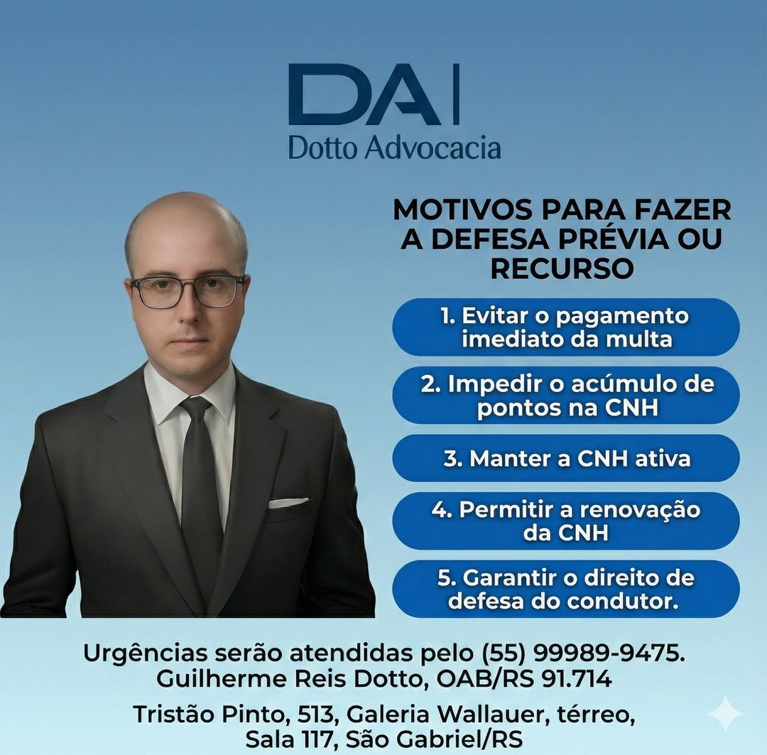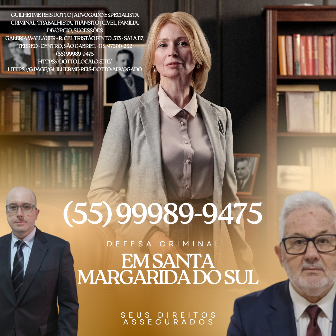 Escritório de advocacia: Trabalhista, Criminal, Cível, Família, Sucessões e Trânsito + Advogado especialista em Direito Processual Civil, Trabalhista, Trânsito e Penal. + Ampla experiência em Divórcio litigioso ou consensual, dissolução de união estável, guarda, alimentos, inventário, adoção, interdição. + Defesas e Recursos de multa, suspensão e cassação de CNH, ação de transferência de pontos. + Atuação física em São Gabriel/RS, na Rua Tristão Pinto, 513, na Galeria Wallauer, Térreo, Sala 117. Atuação em: Rosário do Sul, Santa Margarida do Sul, Vila Nova do Sul. + Advogados Guilherme Reis Dotto, OAB/RS 91.714 e Antônio Carlos Ventorini Dotto, OAB/RS 94.518 24 horas para Urgências: (55) 99989-9475 Agende sua consulta agora mesmo!